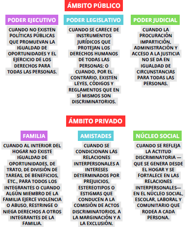 La discriminación, con sus muy variados matices, no es un hecho que se genere y afecte sólo una determinada faceta de la vida humana. Es un fenómeno que involucra y lesiona los distintos ámbitos de desarrollo de las personas. Es así que puede existir discriminación institucionalizada, es decir, aquella que se produce desde los gobiernos, hasta discriminación familiar, nacida y fomentada en el núcleo mismo de los hogares.